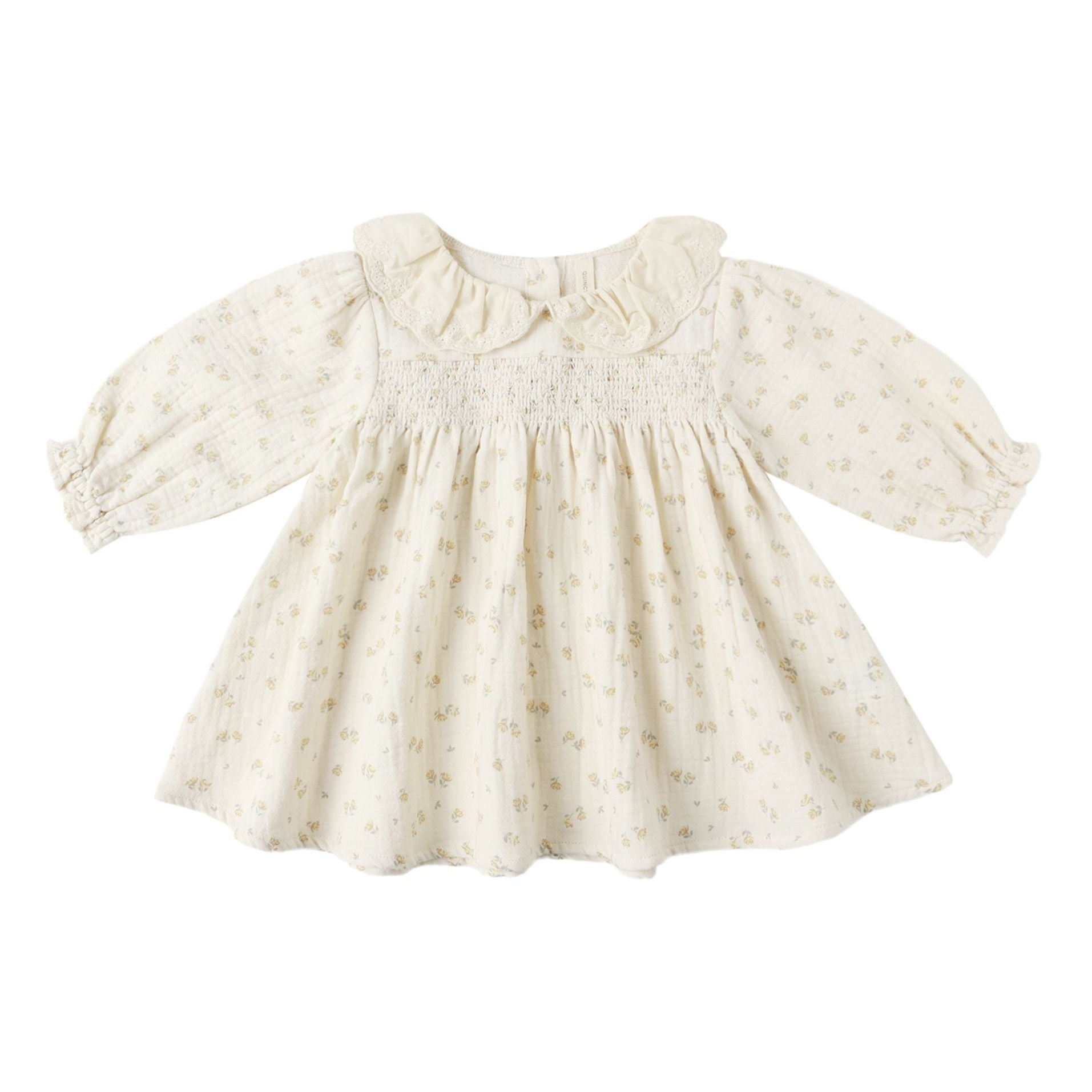Our Callie Dress features a darling eyelet collar, smocked front bodice, gathered skirt, and ruffle sleeves, with buttons at the back for easy dressing. Matching bloomers included with all sizes.