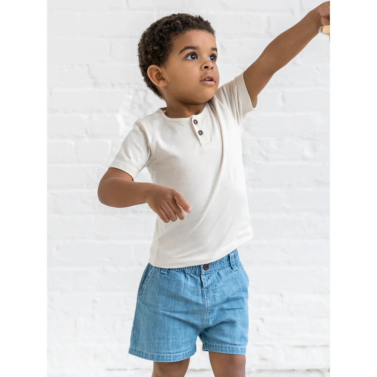 The Luke Chambray Short is the perfect balance of comfort and style for your little adventurer. With an elastic waistband for easy wear and belt loops for a polished look, these shorts are ready for any occasion. Slash front pockets and a back welt pocket provide plenty of space for little treasures, while the topstitch details add a touch of flair. Made from soft organic cotton chambray, these shorts are perfect for warm-weather outings, beach trips, or casual playdates.