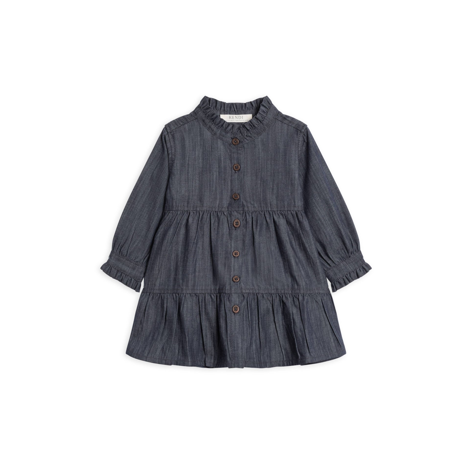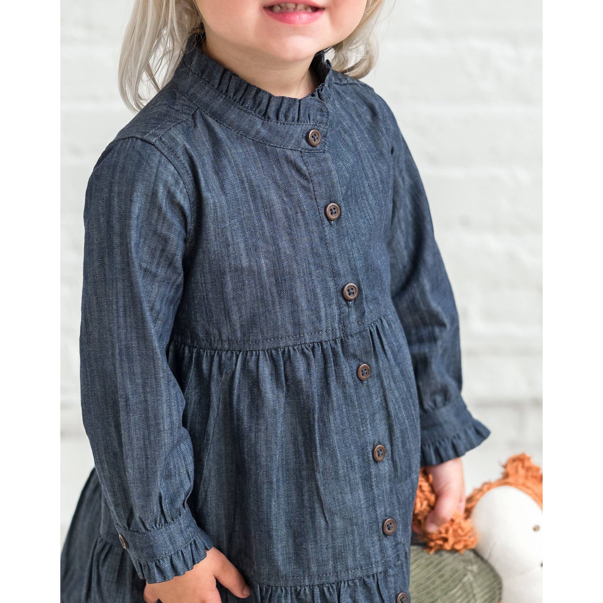 Soft structure and playful charm come together in the Tula Chambray Ruffle Shirt Dress. Made from breathable organic cotton chambray, this sweet dress features a ruffled neckline and cuffs, wooden button front, and a twirl-worthy hem. It’s a versatile style for family photos, school days, and everything in between.