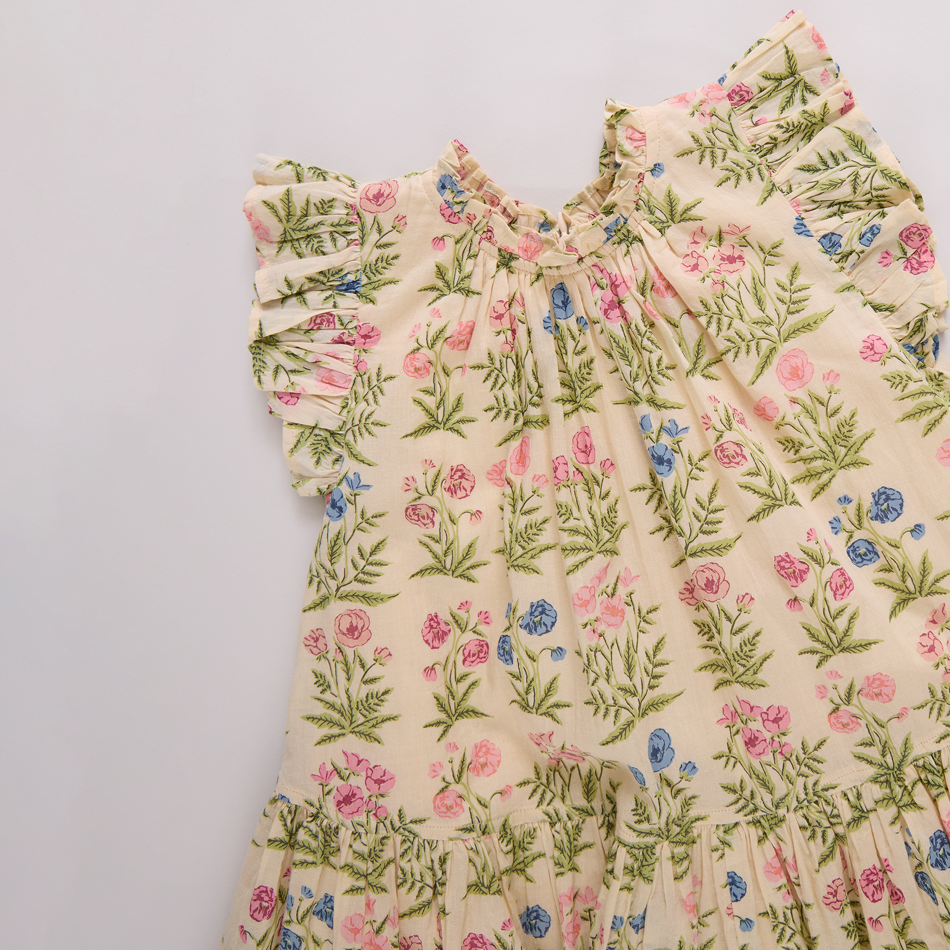Our Girls Harper Dress in Leafy Floral captures the feeling of a sunlit garden in bloom. Soft gathers and fluttery ruffles create a silhouette that feels as light and lovely as spring itself. Matches perfectly with the Baby Girls Wynne Bubble and the Women’s Marilyn Bell Sleeve Dress.