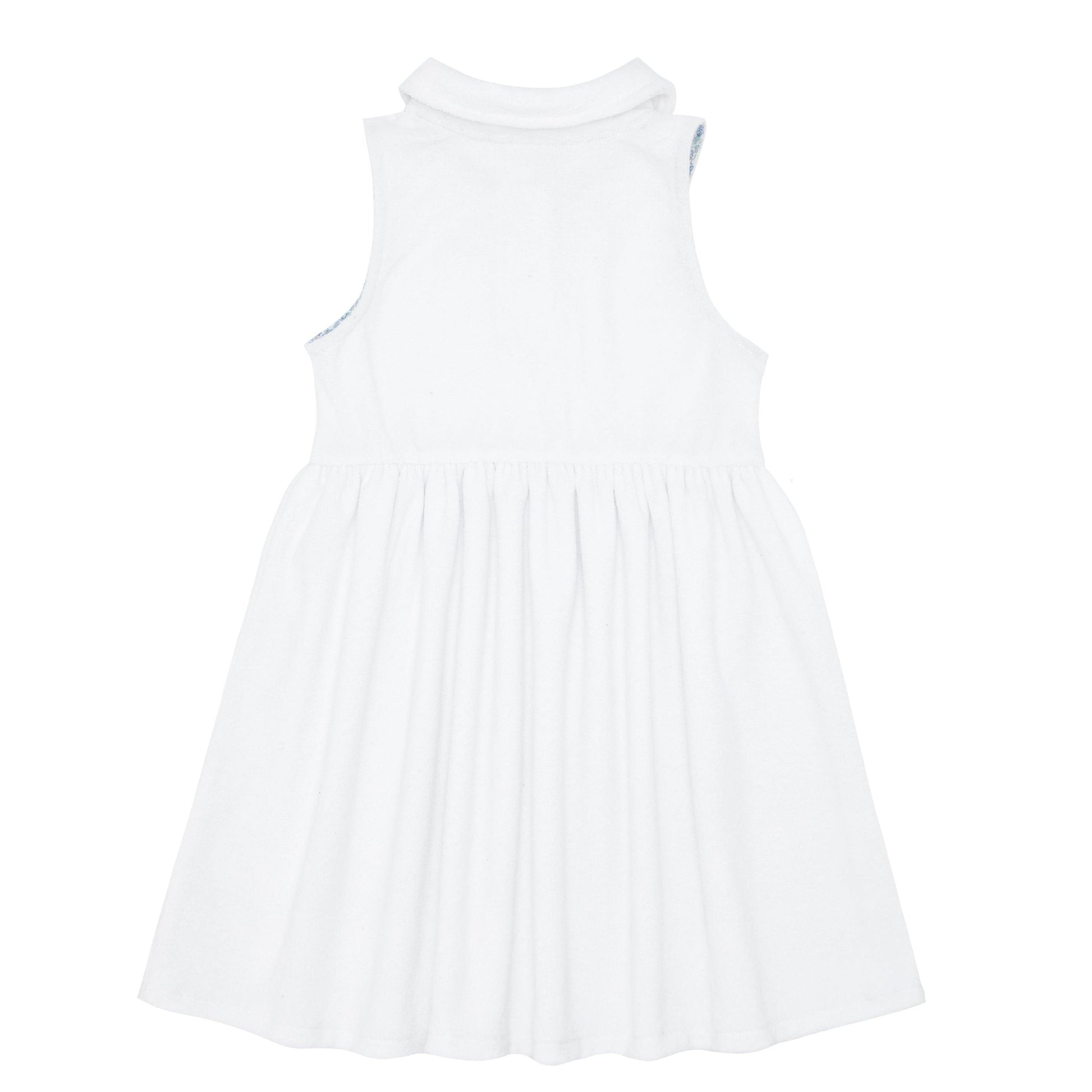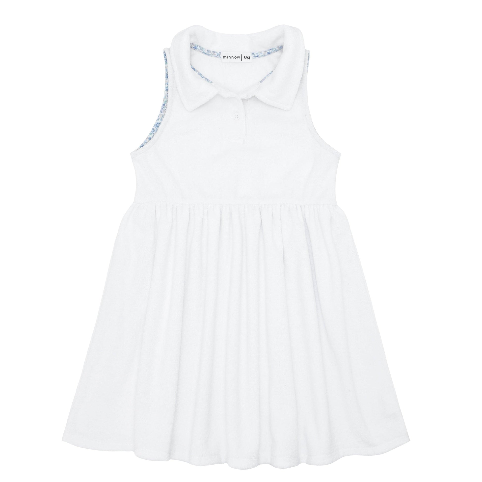 this classic swing tennis dress is as versatile as it is comfortable. the cozy french terry fabric in white is breathable and low maintenance, perfect for post-swim or playtime. the relaxed fit, button front, and gathered waist make it an easy, elevated staple that can take you from swim to play, all day!