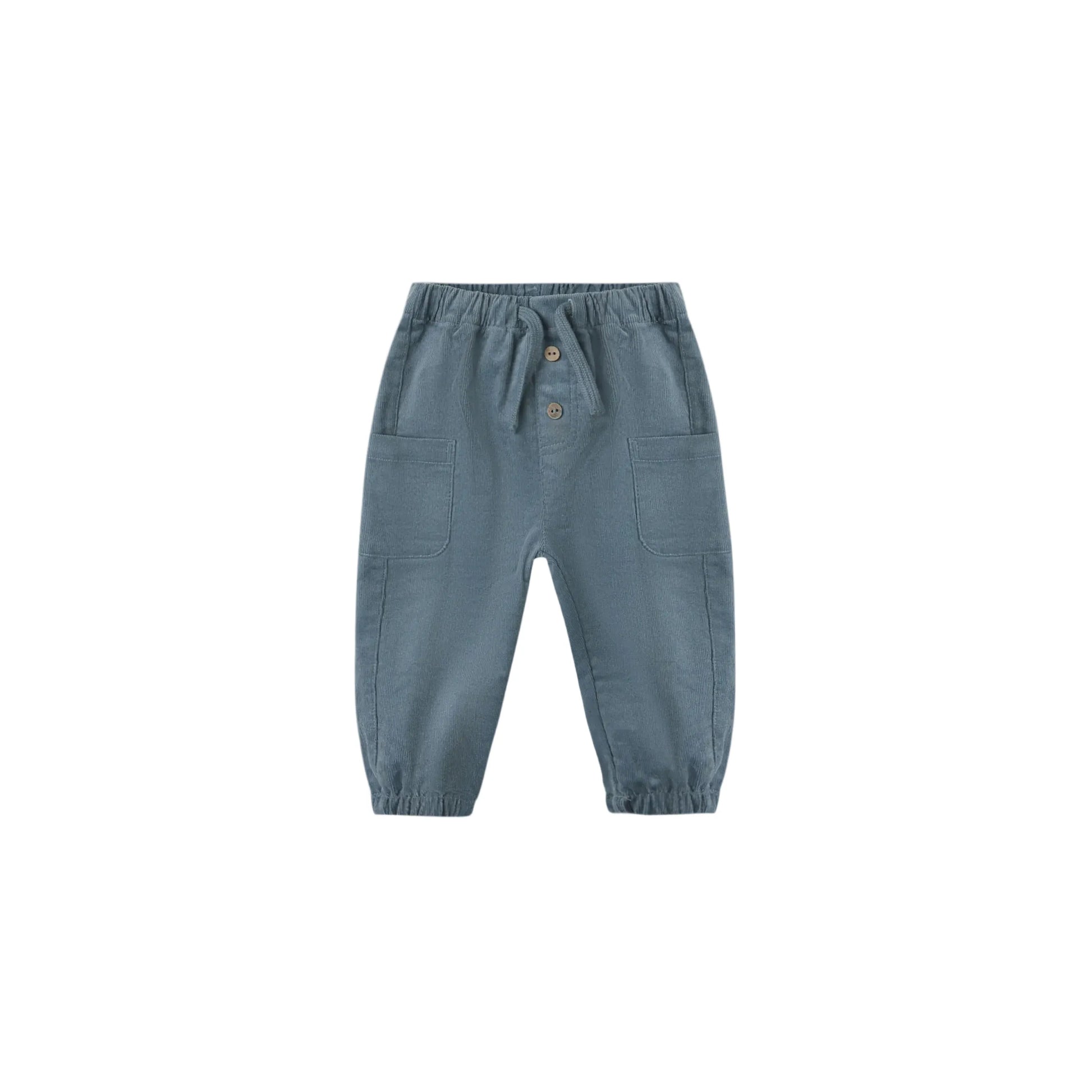 Comfortable corduroy pants with an elastic waistband and leg openings, adjustable drawstring, and side patch pockets.