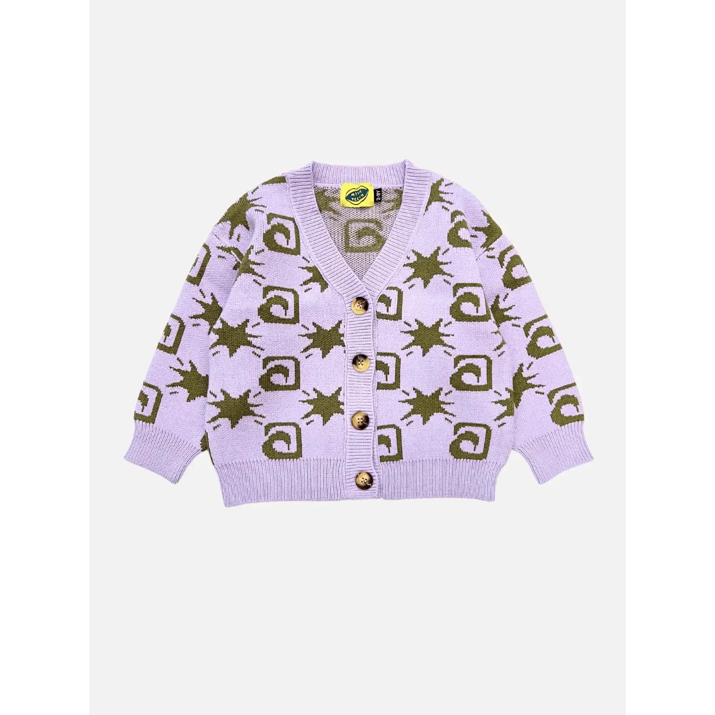 V-neck cardigan has front buttons and ribbed trim. All-over monogram grid pattern of starbursts and spirals, in our bestselling unisex silhouette.