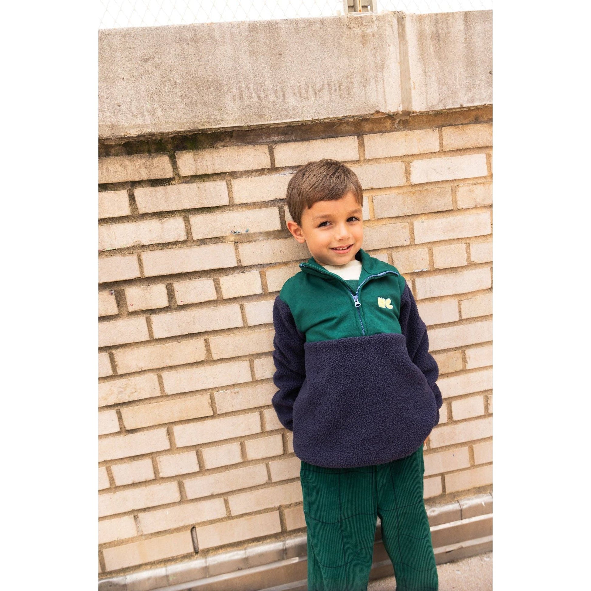 A cozy classic, our Navy Sherpa Zip up is made from a soft blend of recycled and organic cotton. With a bold navy and green colorblock design, plush sherpa texture, and easy half-zip closure, it’s the go-to layer for cool school days and weekend adventures.
