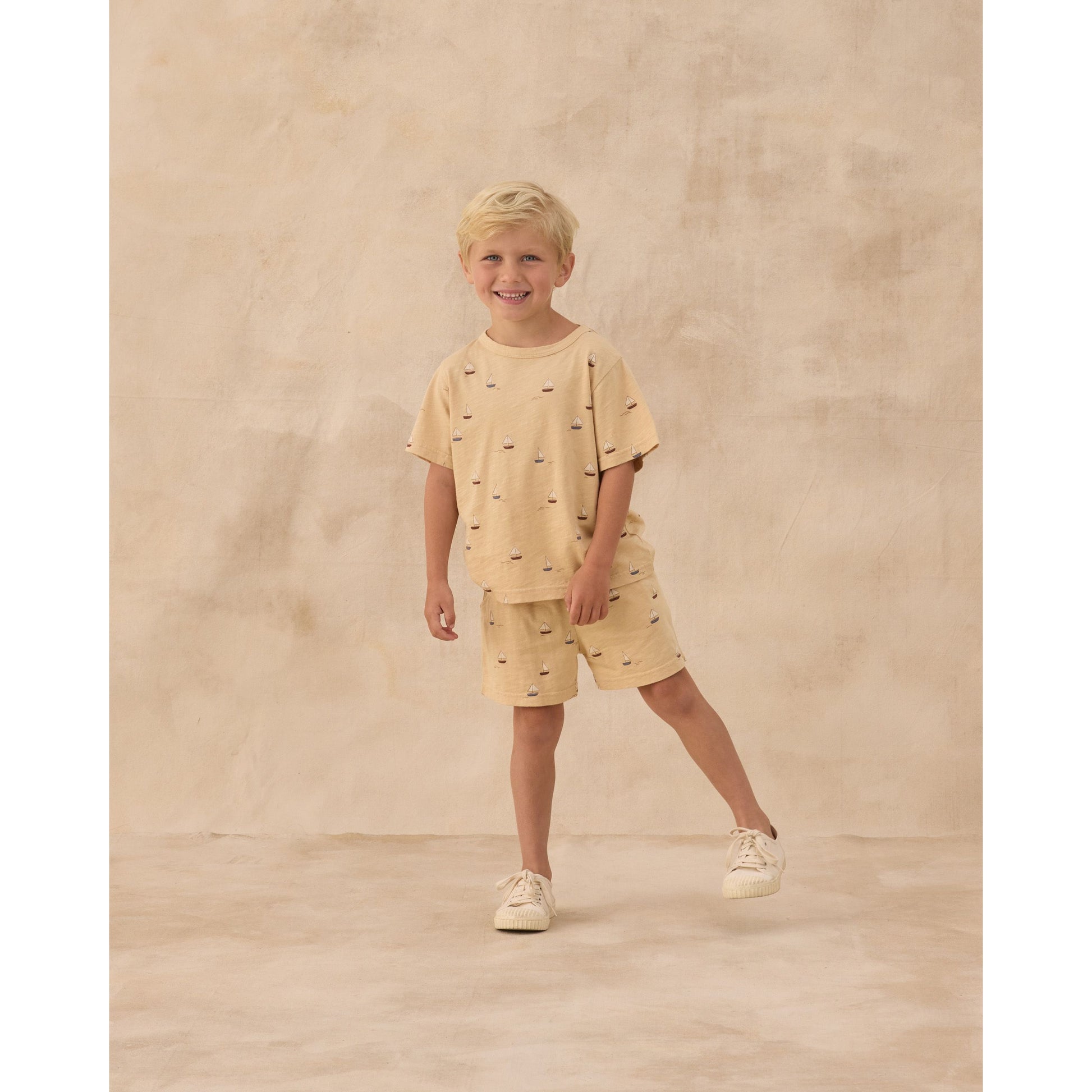 Featuring our 'sailboats' print on our 'butterscotch' hue. This fun retro print will sail you right into summer.