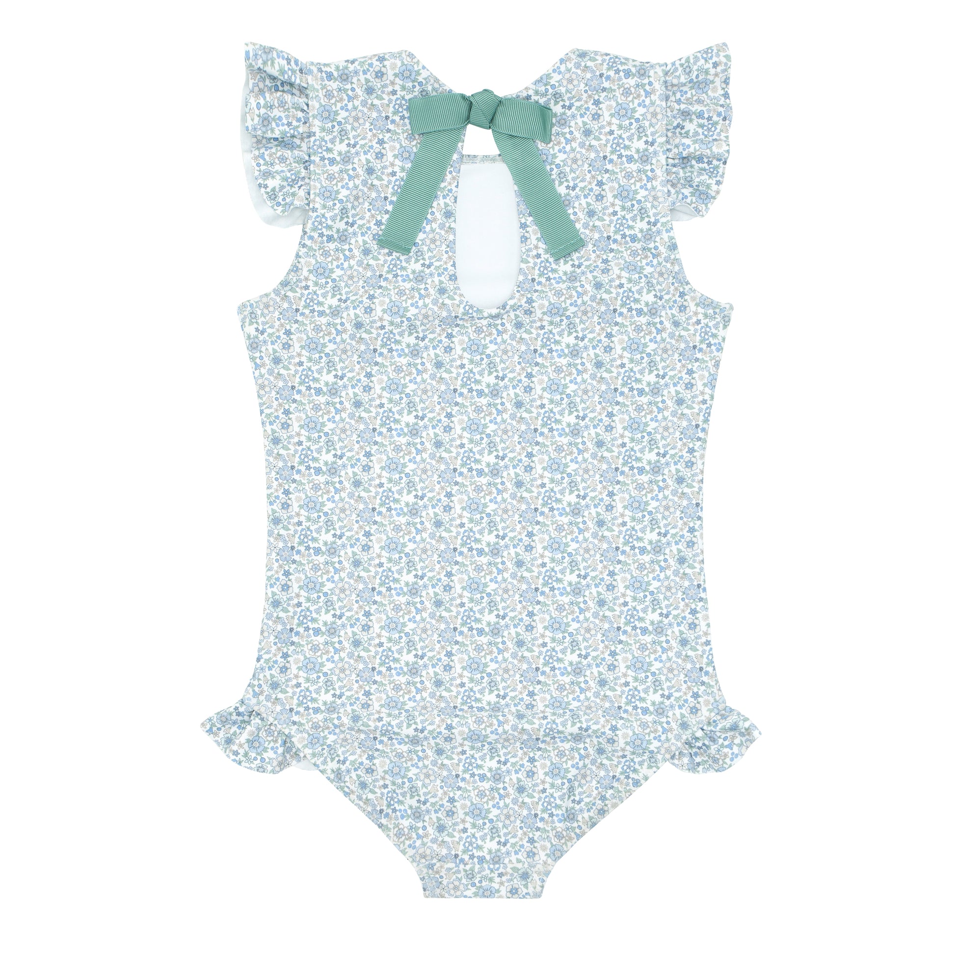 feminine sun coverage shines in our best selling ruffle sleeve silhouette. featuring semi-sun coverage with a fitted, high neckline and contrasting grosgrain ribbon bow with hidden button closure. the chic ruffle cap sleeves offer mobility with a touch of sweetness. topped off with a feminine ruffle hip detail just like our long sleeve rash guard one piece.