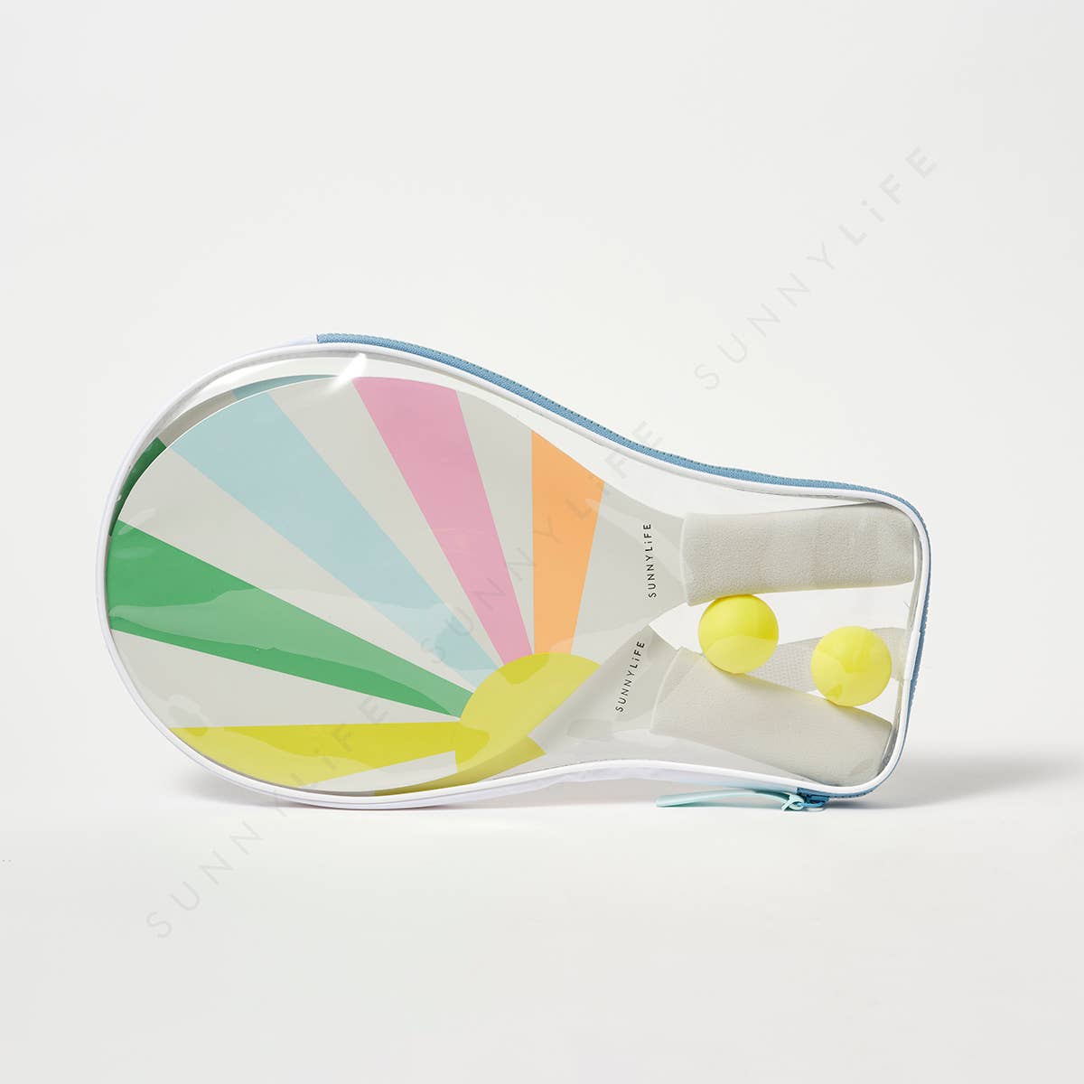 Enjoy beach day bliss with SUNNYLiFE's Pastel Gelato Beach Bats. Featuring a bold sunburst print and a confectionary color scheme, our iconic beach bats just got a super sweet makeover. Whether you're heading to the park, backyard or beach, you can always rely on our much-loved, classic beach bat set to keep the good times rolling all day long. Including easy-to-grip handles, two colorful balls and a handy zip-up travel case, playing the day away doesn't get any easier than this!