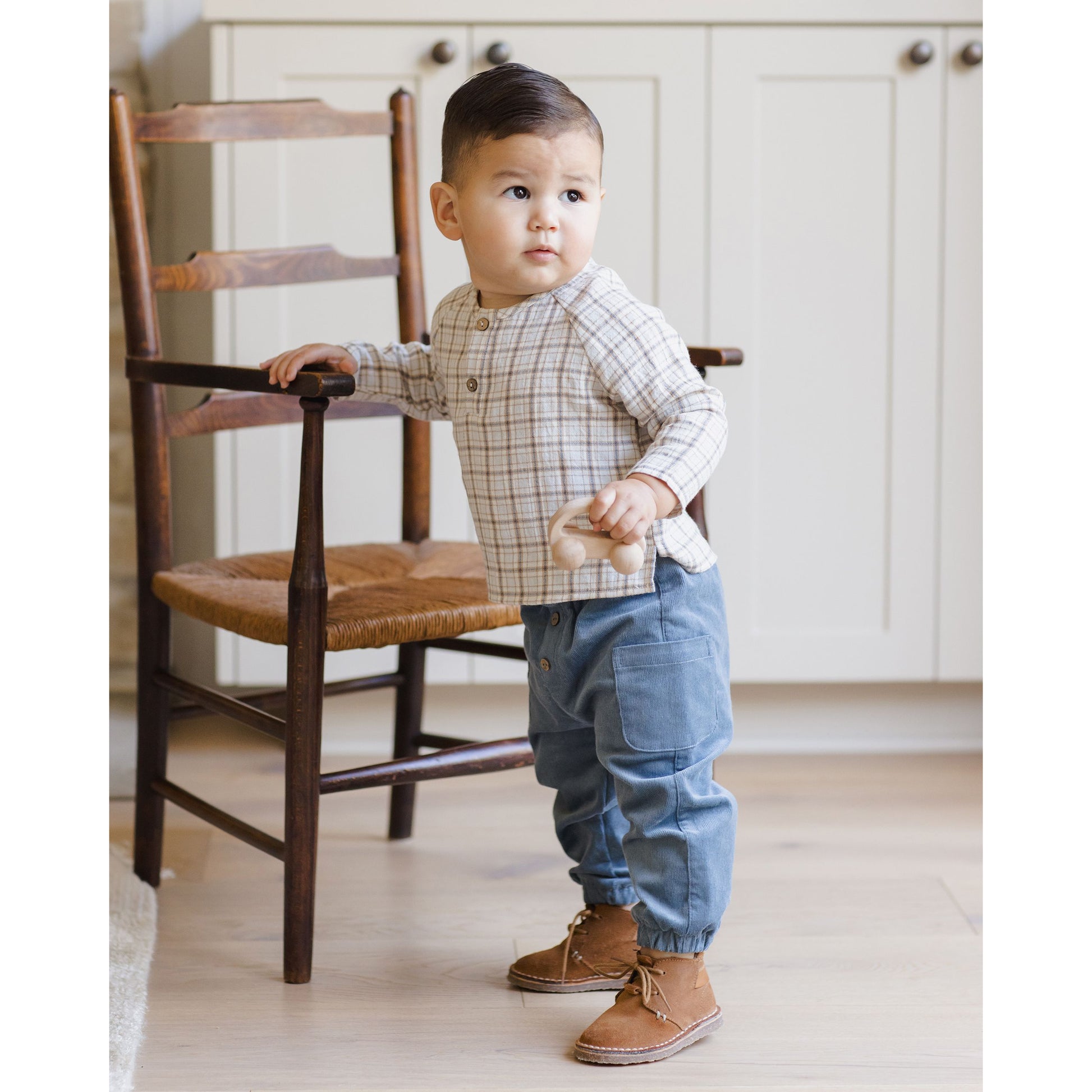 Our Zion Shirt, crafted from soft cotton gauze, features a boxy fit, long sleeves, and a button-front closure for easy wear. Pair with our Woven Pants for a coordinated, dapper look.